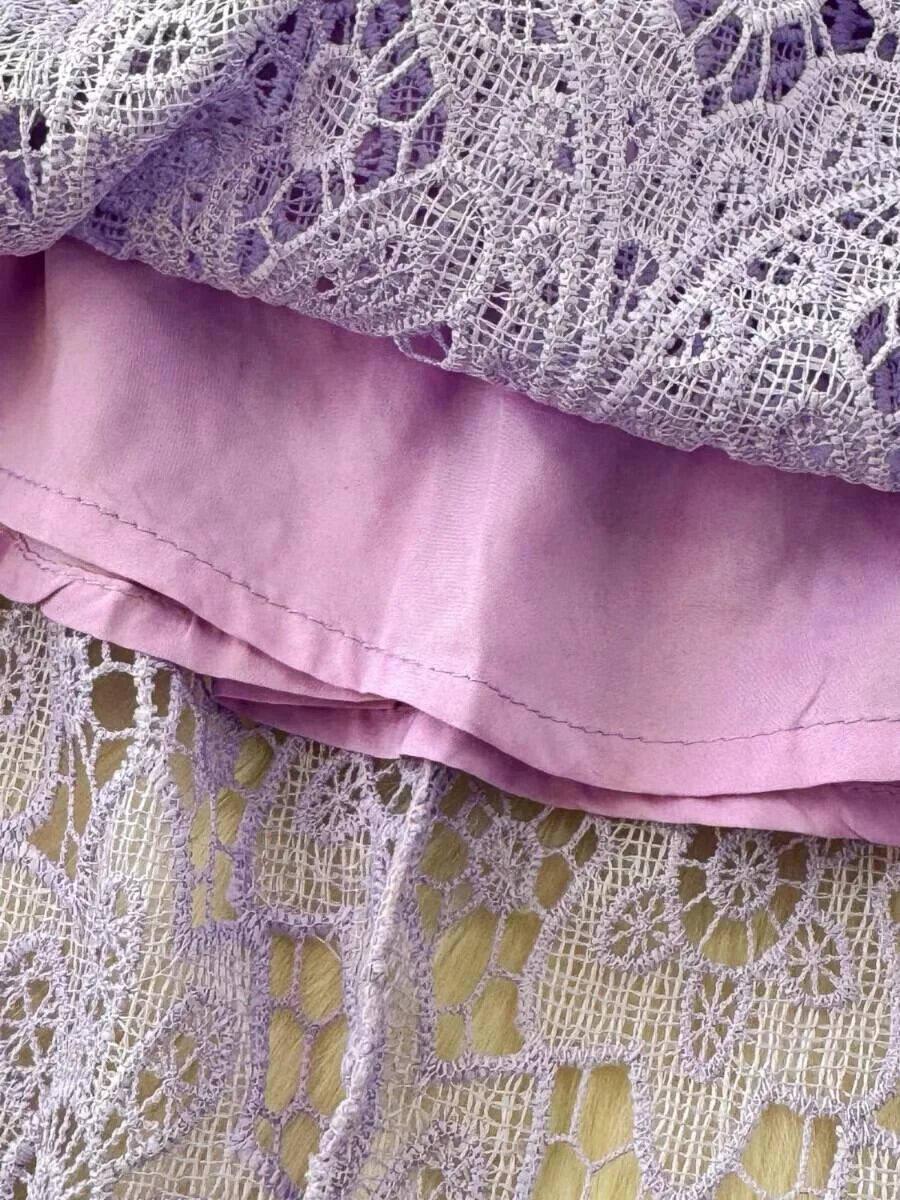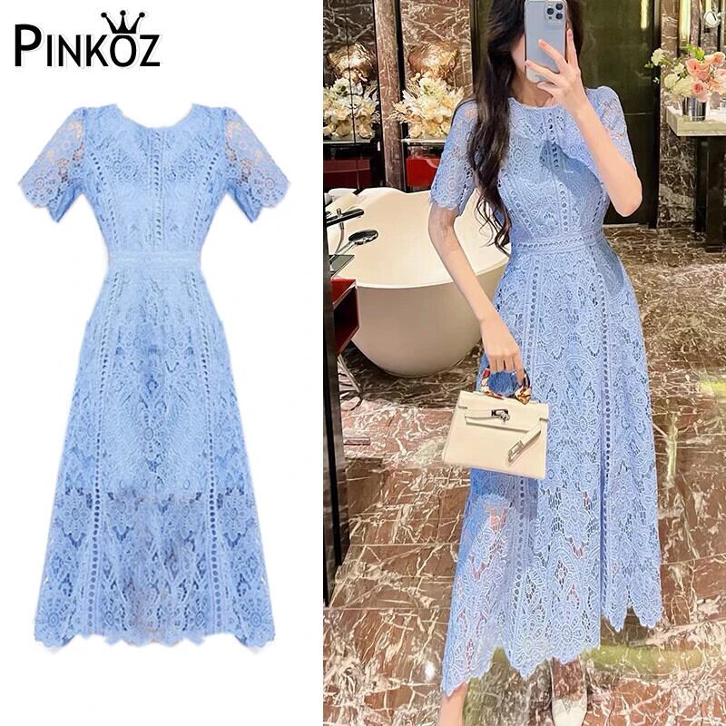 Pinkoz デザイナーレースブルーアウト o ネックエレガントドレス春夏新ファッションオフィスレディドレスヴィンテージローブ za ピンク スプリング 春物 サマー 夏物 Oネック ビンテージ 会社 学校 通勤や通学にも