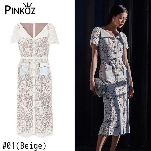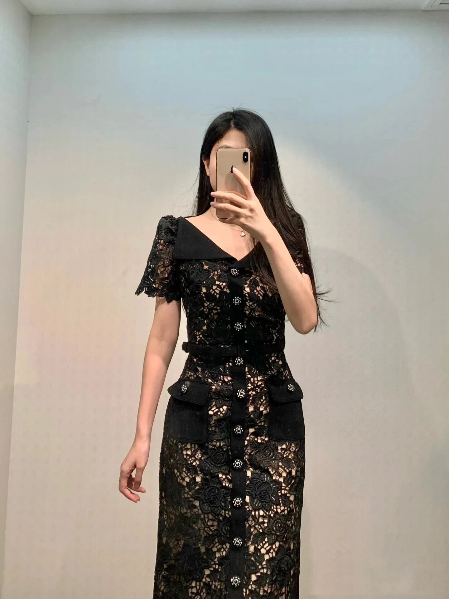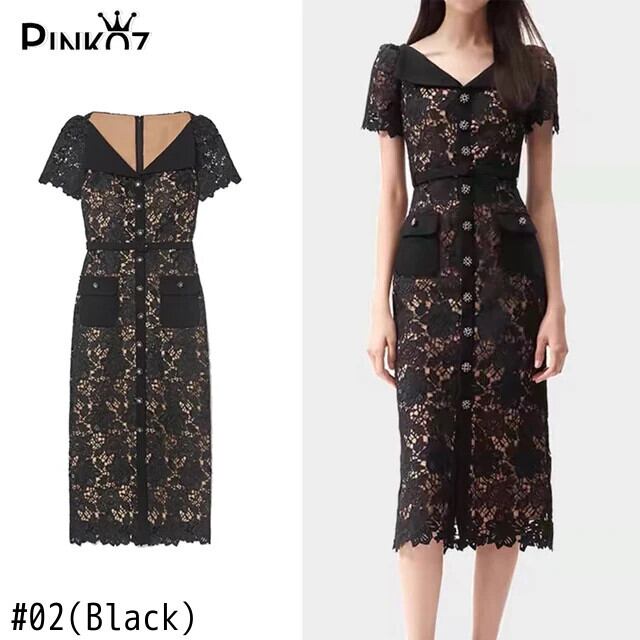 Pinkoz 滑走路デザイナーレースターンダウン襟黒ぬるぬるペンシルドレスシングルブレストボタン高級ドレス + ベルト ピンク ブラック ハーネス