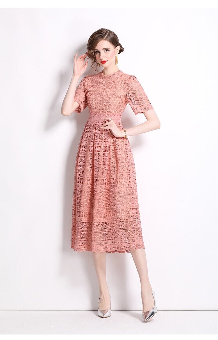 Pinkoz デザイナーピンクレースミディドレス O ネック半袖カジュアルエレガントオフィスレディアウトヴィンテージ Vestidos ローブデムジェ ショート ハーフスリーブ Oネック ビンテージ 会社 学校 通勤や通学にも