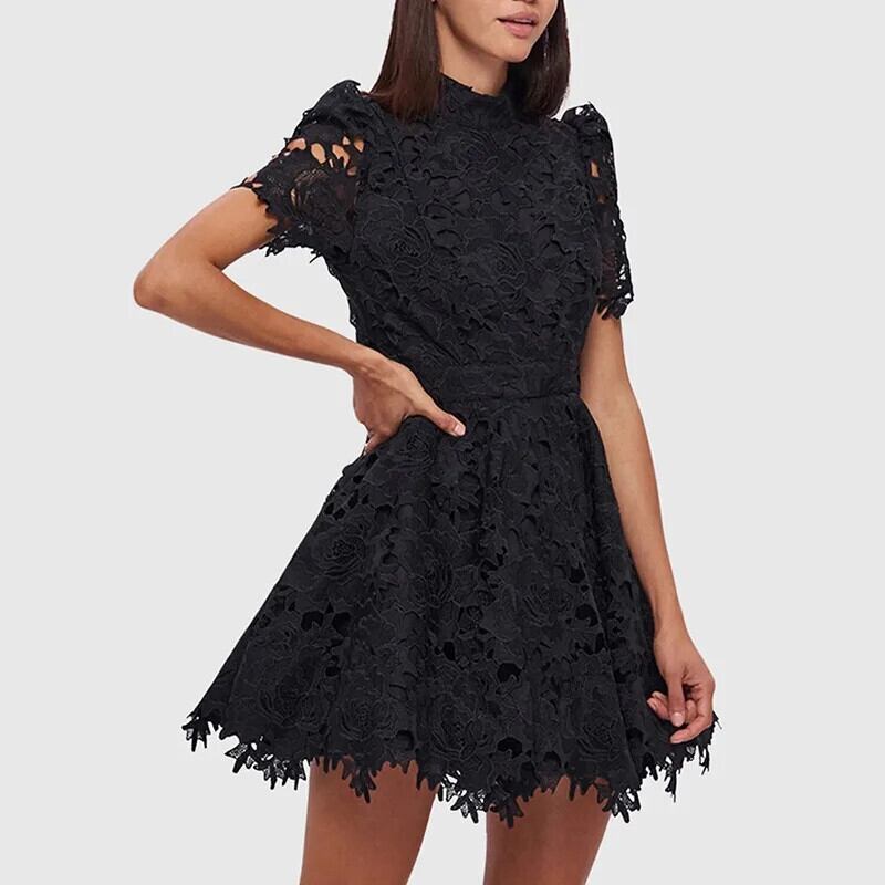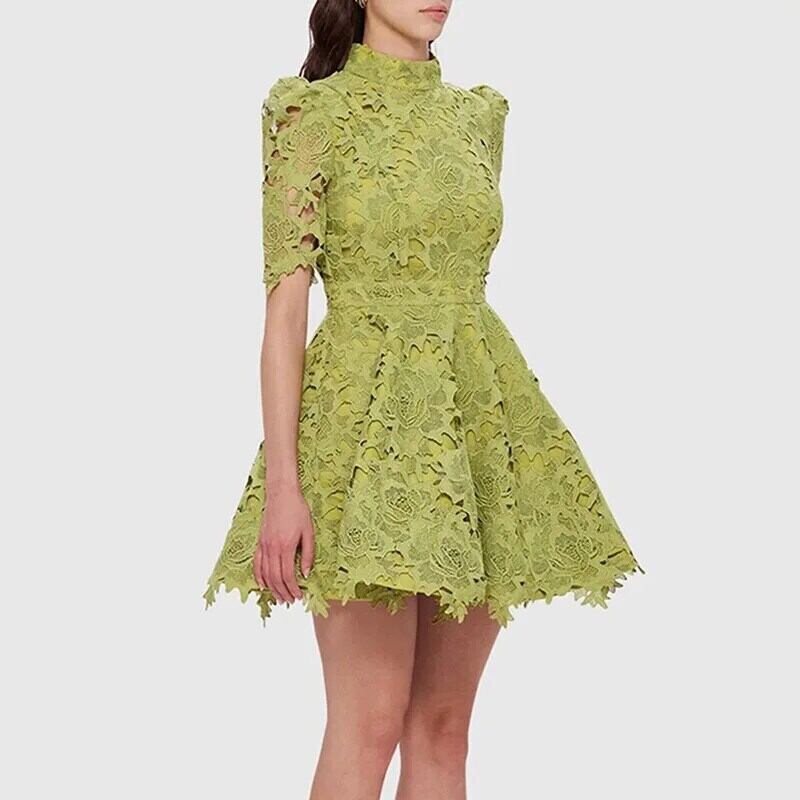 Pinkoz デザイナースタイリッシュ A ラインレースミニドレス半袖スタンドカラーアウトパーティーグリーンヴィンテージ Vestidos ローブデムジェ ショート ピンク ハーフスリーブ Aライン ビンテージ