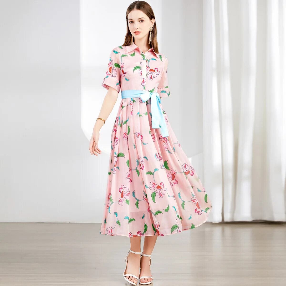 Pinkoz 滑走路デザイナー ピンク花柄プリント ターンダウン襟半袖夏 A ライン ドレス サッシ ヴィンテージ ベスト ショート ハーフスリーブ サマー 夏物 Aライン ビンテージ