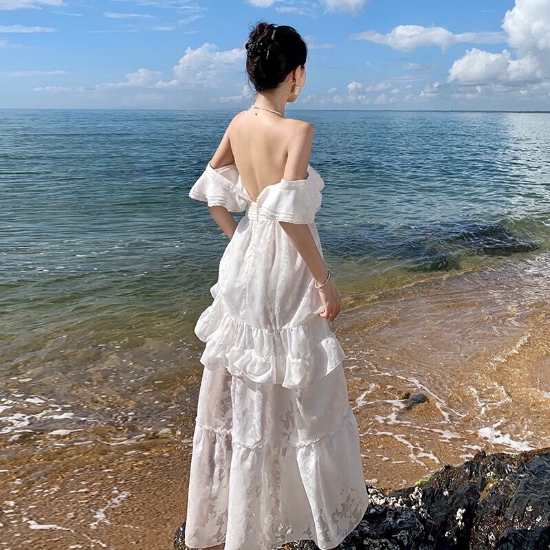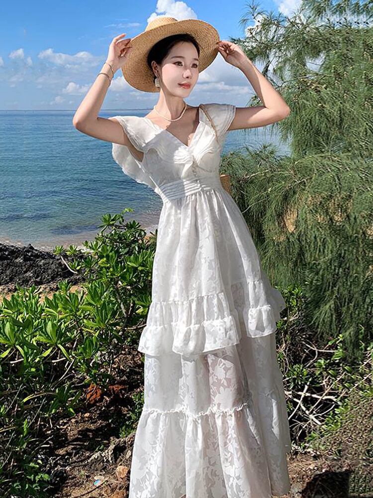 Pinkoz 滑走路デザイナースタイリッシュ白いレースアウトフリルマキシスラッシュネック A ラインパーティーナイトドレスヴィンテージ Vestidos ローブ ピンク ホワイト ラッフル Aライン ビンテージ