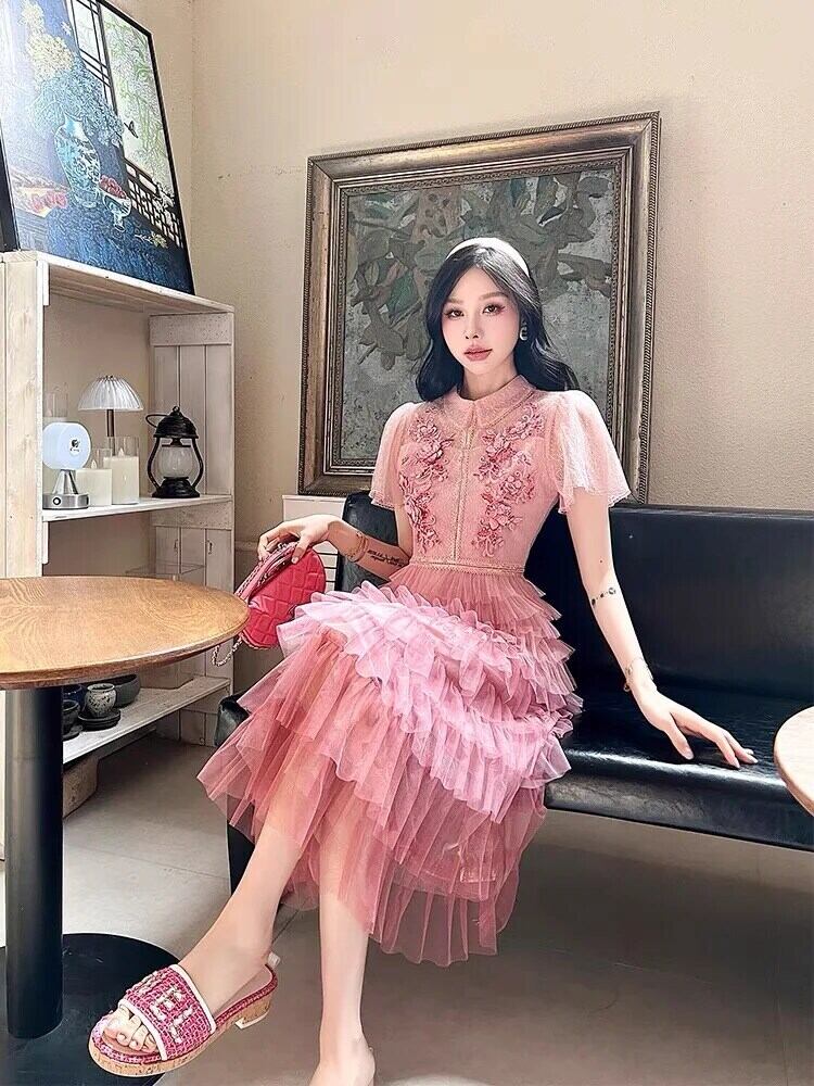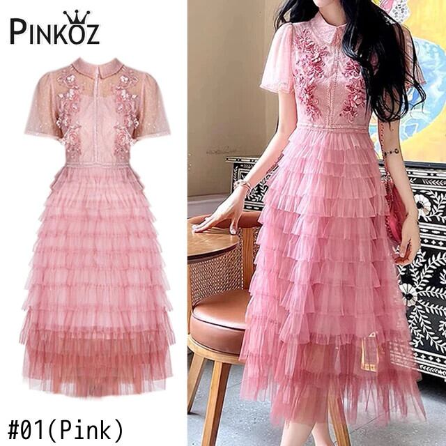 Pinkoz ピンクメッシュカスケードレイヤービーズスパンコールピーターパンカラー半袖ミディドレスパーティーナイトボヘミアンドレス ショート ハーフスリーブ