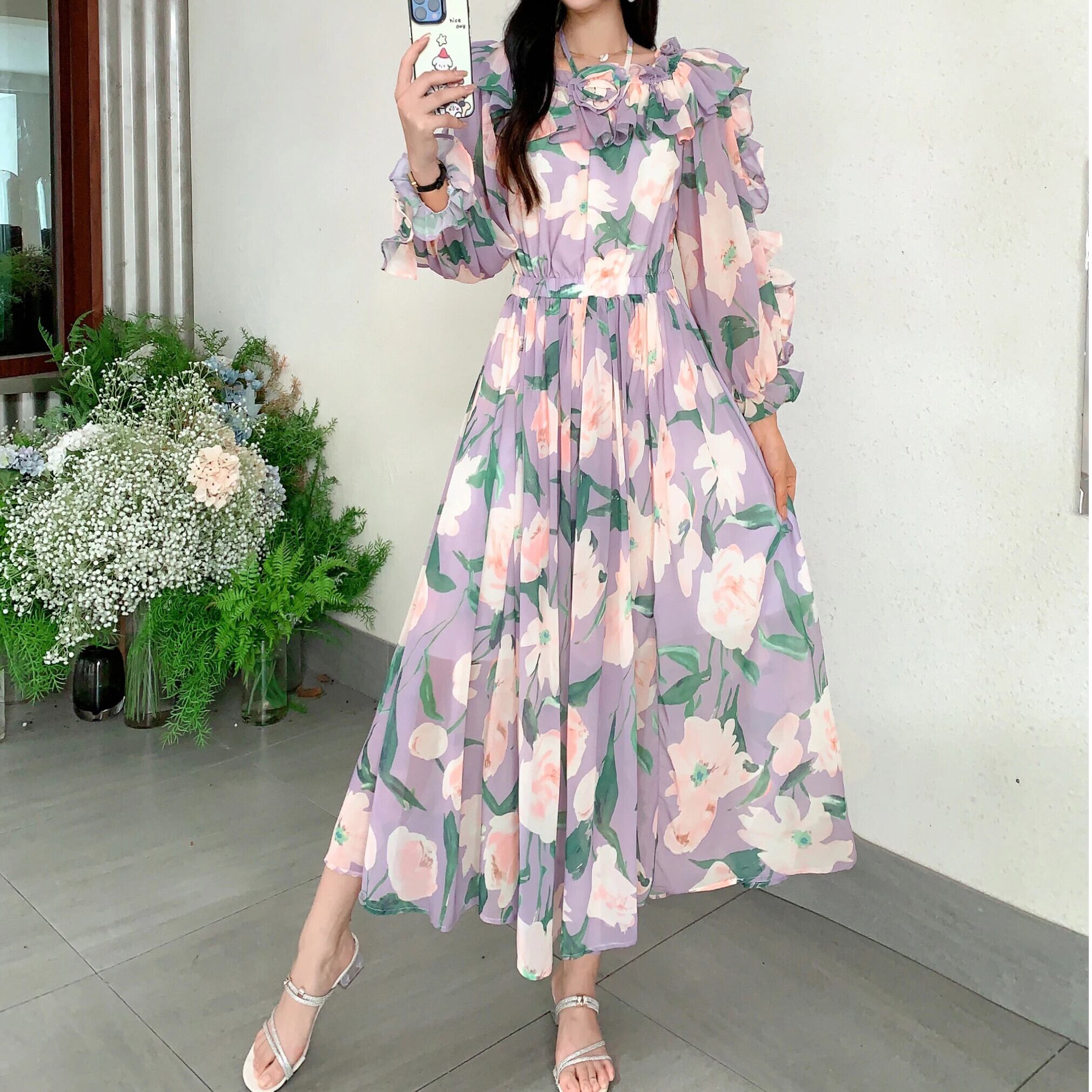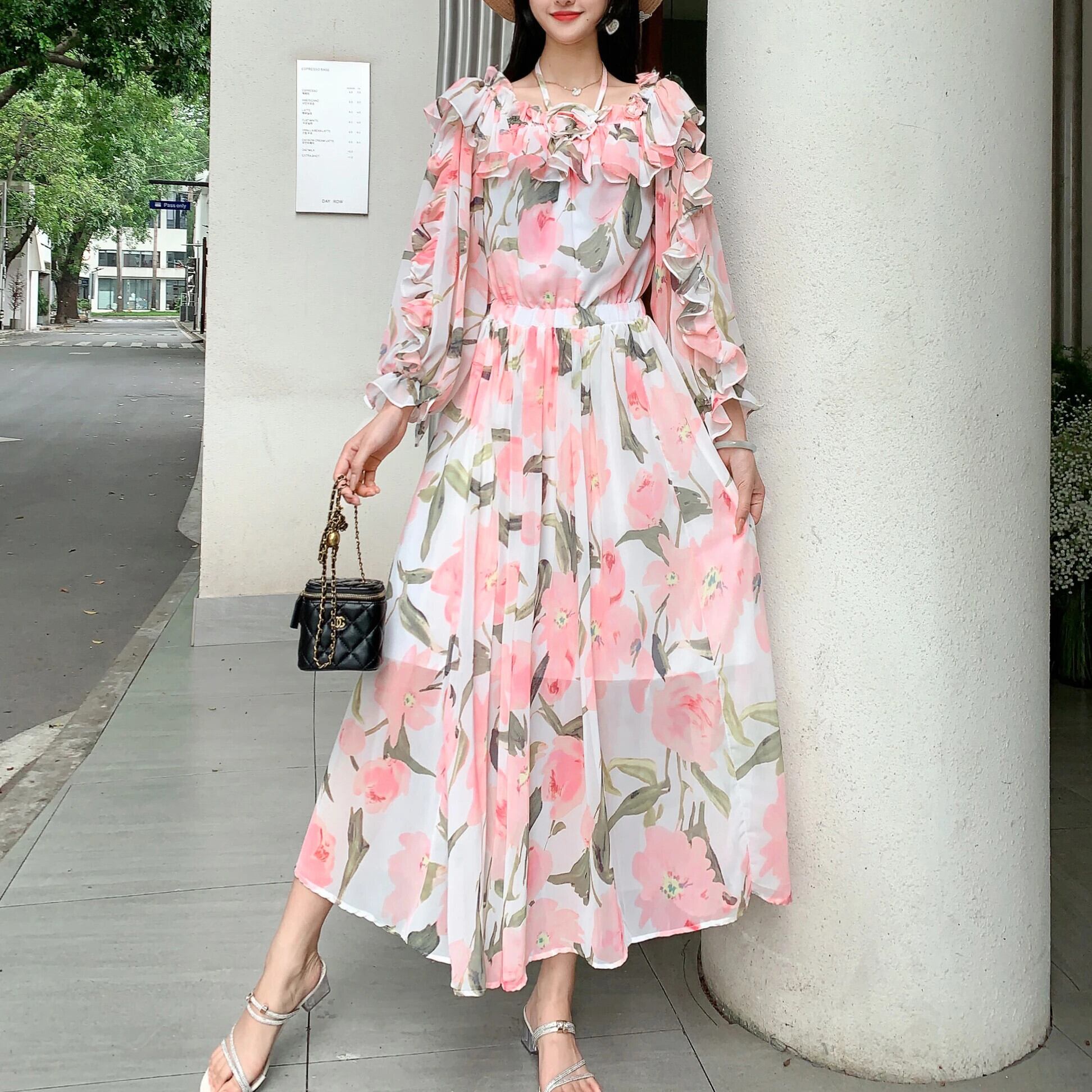 Pinkoz 滑走路デザイナーホリデーシック花柄オフショルダー 3D フラワーアップリケミディ非対称ドレス Vestidos ローブ ピンク フラワーデザイン