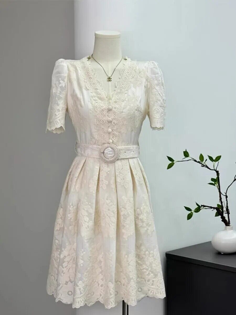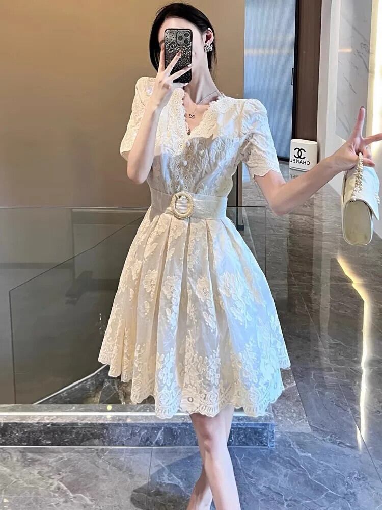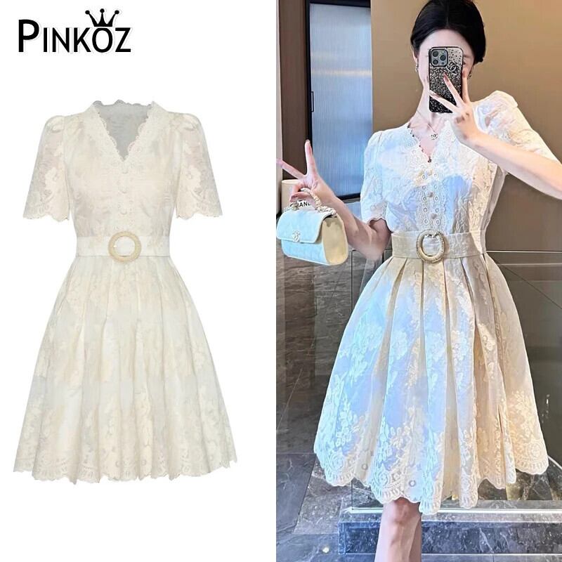 Pinkoz デザイナーヴィンテージ V ネックサマー刺繍ミニドレス A ラインドレスボタンシングルブレストドレスベルト付き Vestidos ピンク 夏物 ハーネス Vネック Aライン ビンテージ