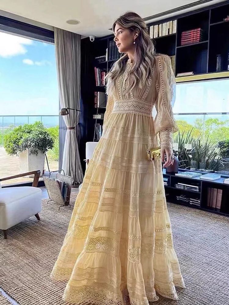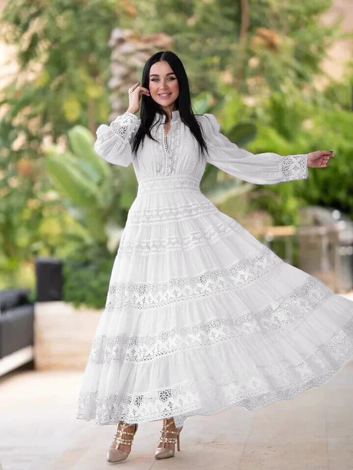 Pinkoz デザイナースタイリッシュ高級パッチワークレースマキシドレスアウトホワイトランタンスリーブパーティー Vestidos ローブ ピンク
