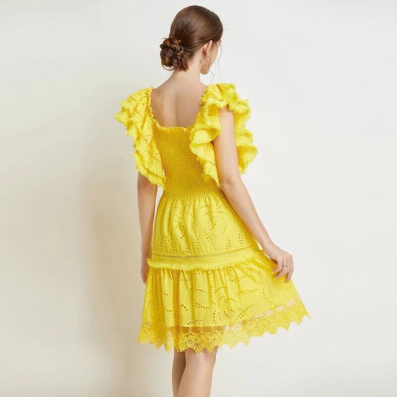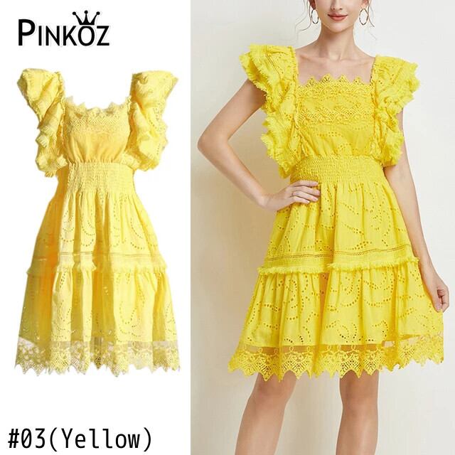 Pinkoz デザイナーミニ A ラインパッチワークドレスノースリーブイエローパーティーレースアウト夏ヴィンテージvestidos mujer ピンク サマー 夏物 Aライン ビンテージ