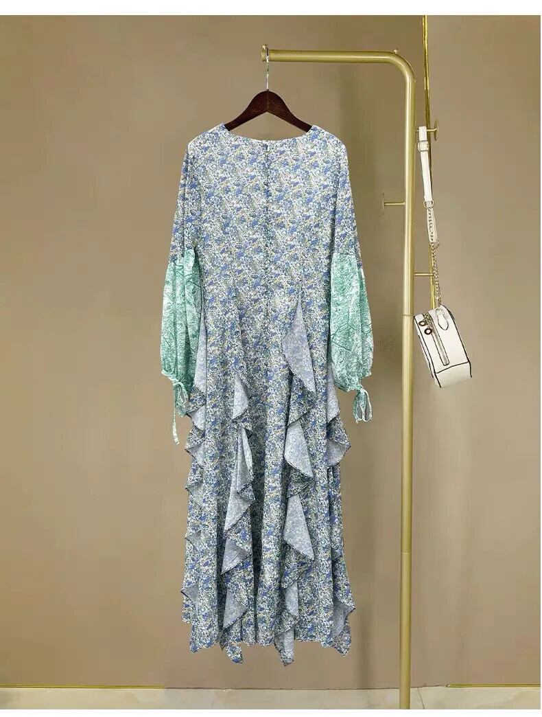 Pinkoz デザイナードレスマキシロング花フリルシフォンドレス V ネックスタイリッシュセレブヴィンテージパリ Vestidos ローブシック ピンク ラッフル 花柄 Vネック ビンテージ