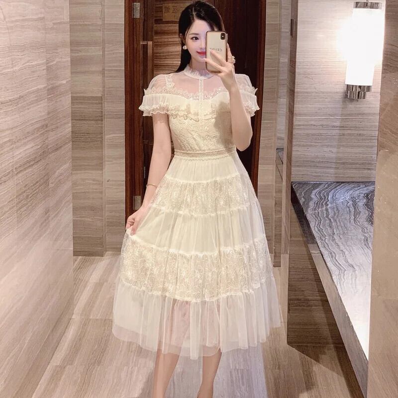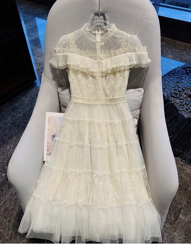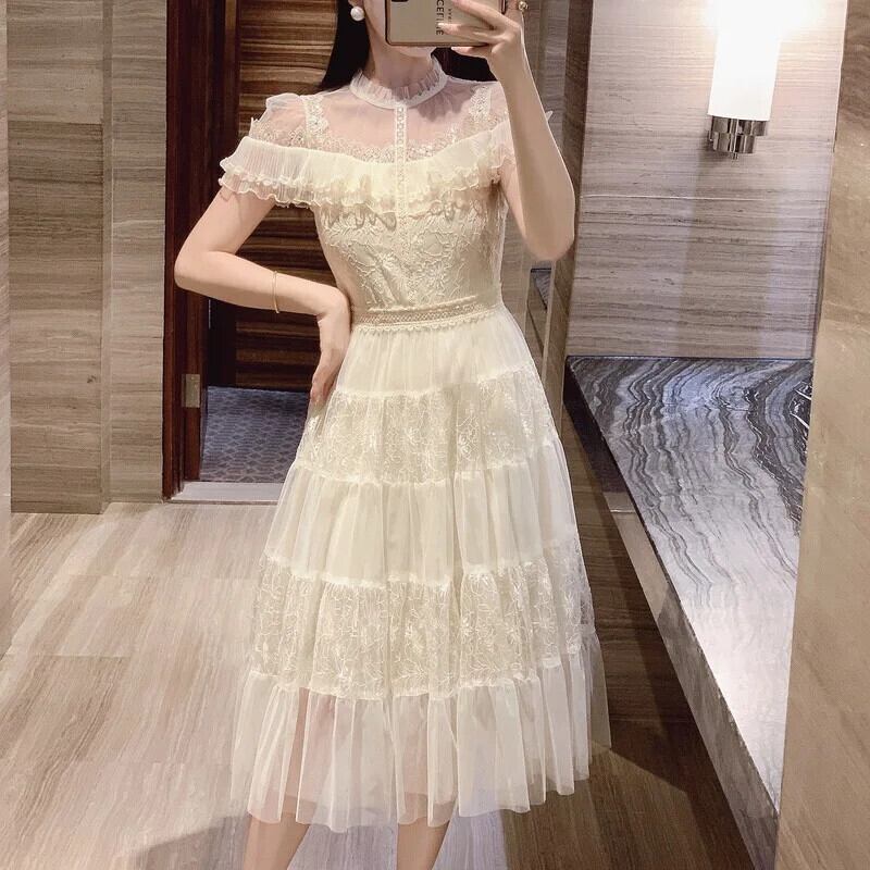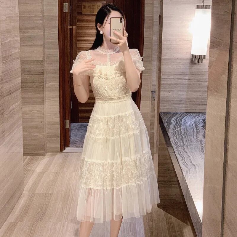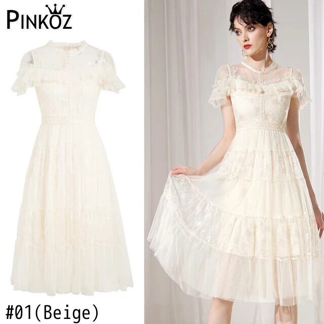 Pinkoz デザイナーベージュメッシュ妖精ミディドレスパッチワークフリルヴィンテージパーティーエレガント A ラインドレス Vestidos レイヤードローブ ピンク レッド ラッフル Aライン ビンテージ