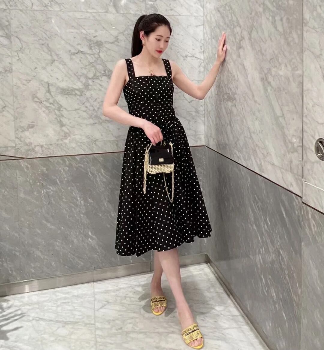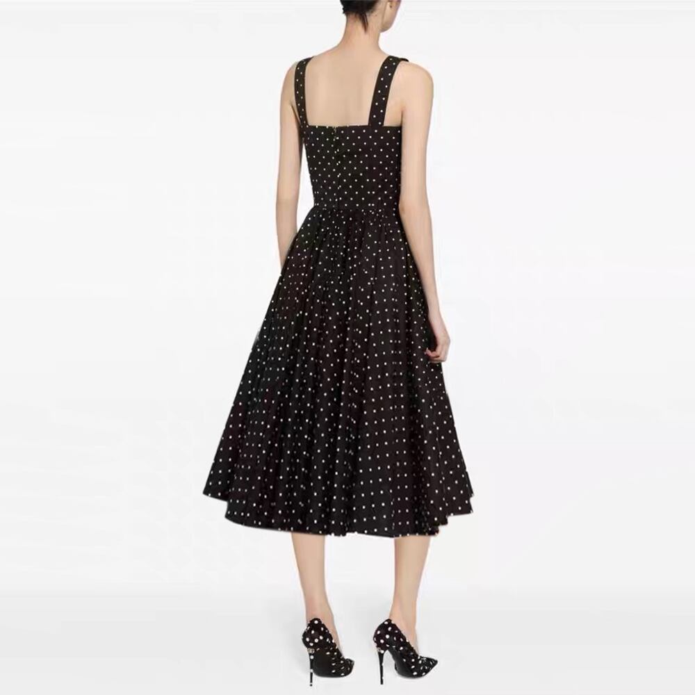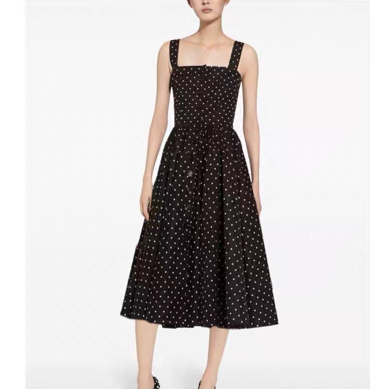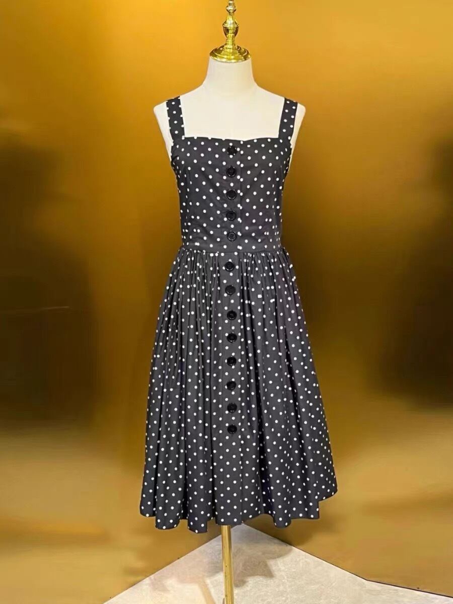Pinkoz 黒水玉スパゲッティストラップミディドレスシングルブレストサマーナイト A ラインパーティーファッションカジュアルドレスヴィンテージ ピンク ブラック 夏物 Aライン ビンテージ