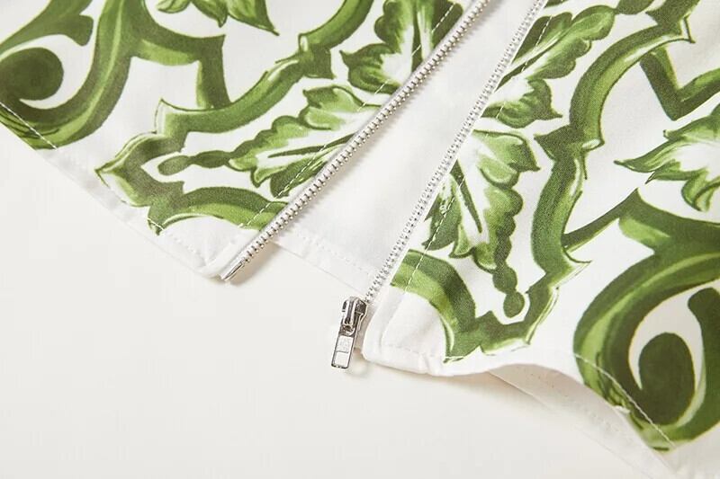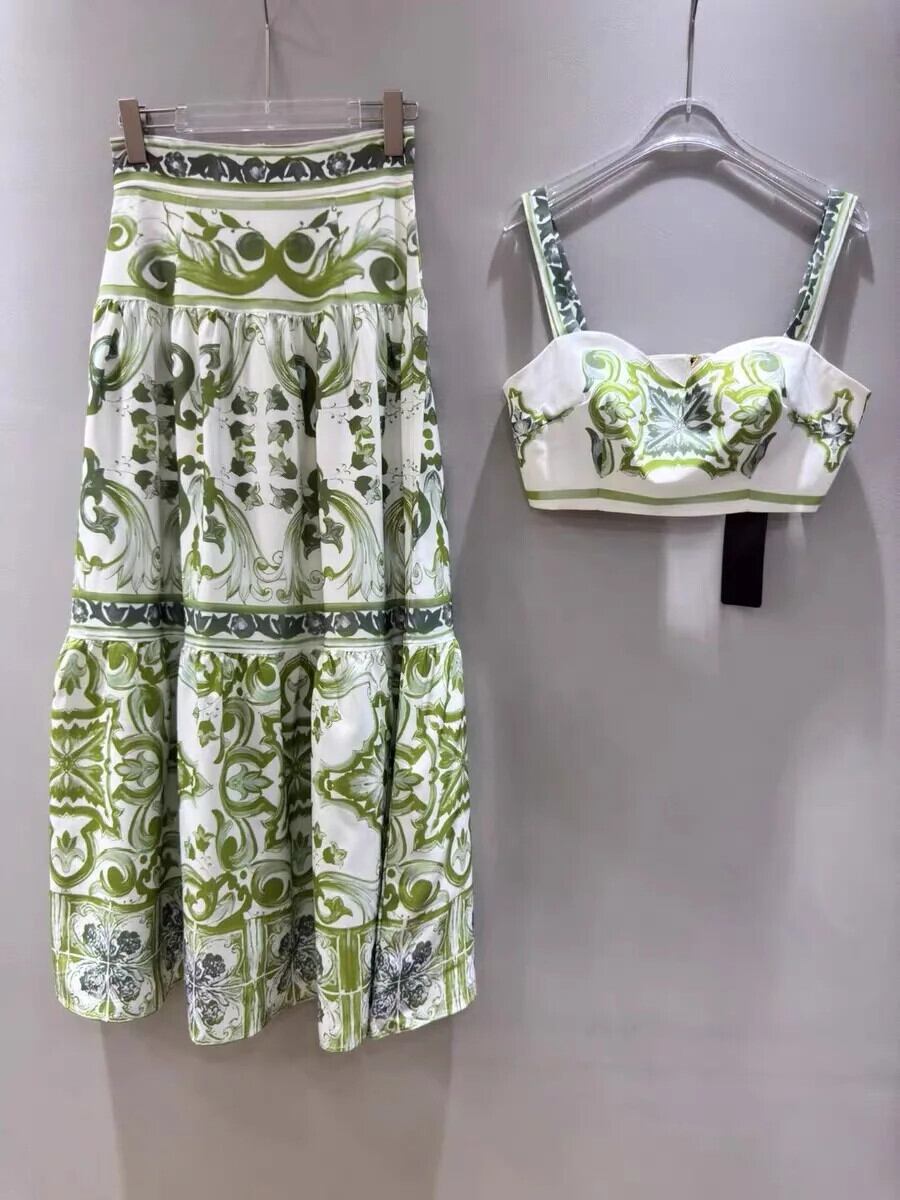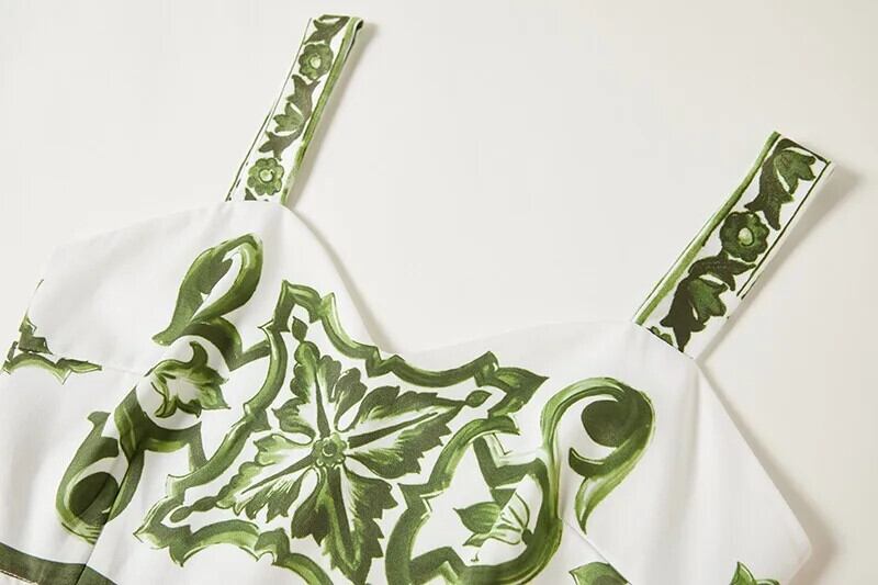 Pinkoz 滑走路デザイナースタイリッシュ 2 個セットグリーンパターンプリントショートキャミソールトップス夏マキシスカートスーツファッション衣類 ピンク サマー 夏物