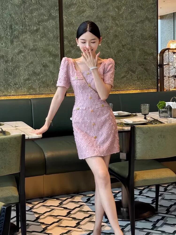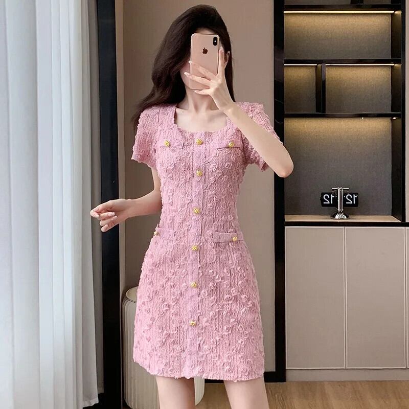 Pinkoz 滑走路デザイナーピンクボタンミニドレス半袖鉛筆エレガントドレスオフィスレディヴィンテージ Vestidos ローブデ ショート ハーフスリーブ ビンテージ 会社 学校 通勤や通学にも