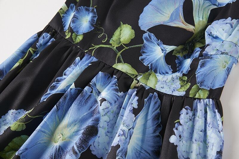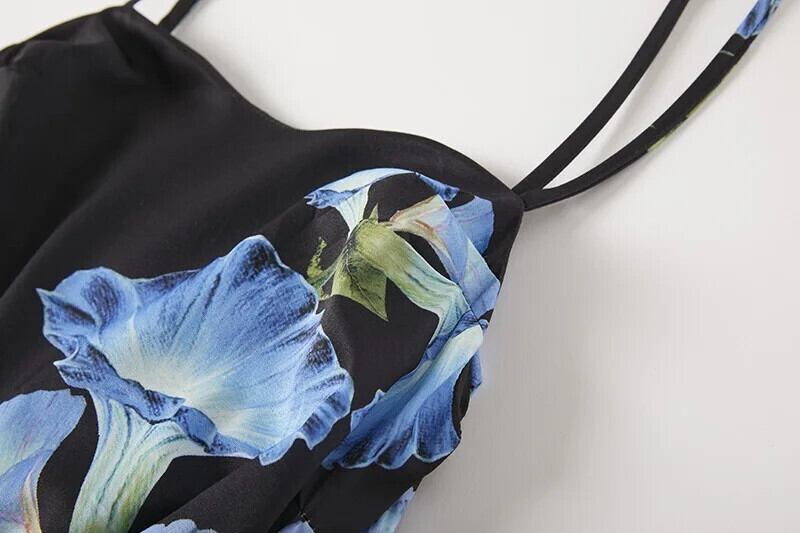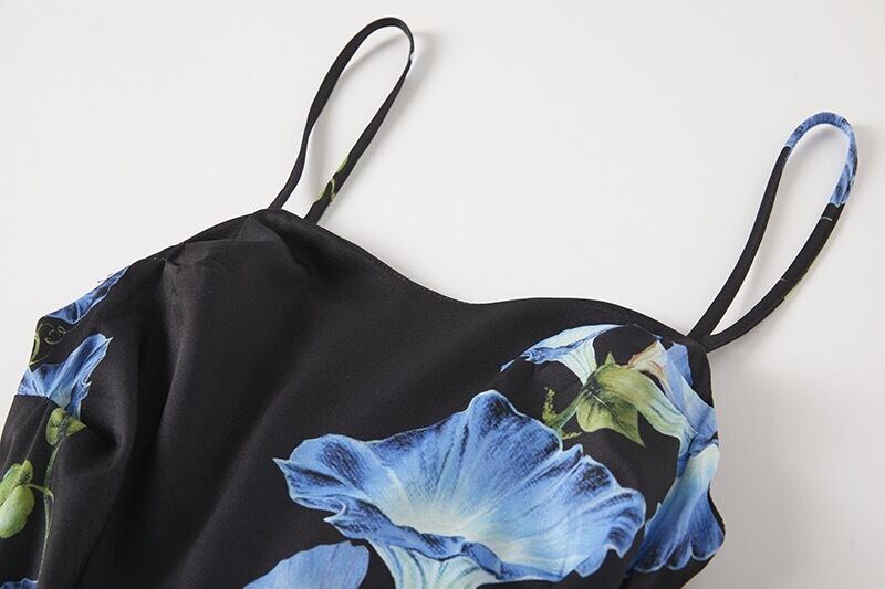 Pinkoz デザイナーブルー花柄プリントスパゲッティストラップミディドレスカジュアル A ラインホリデーシックファッションドレス Vestidos ピンク Aライン フラワーデザイン