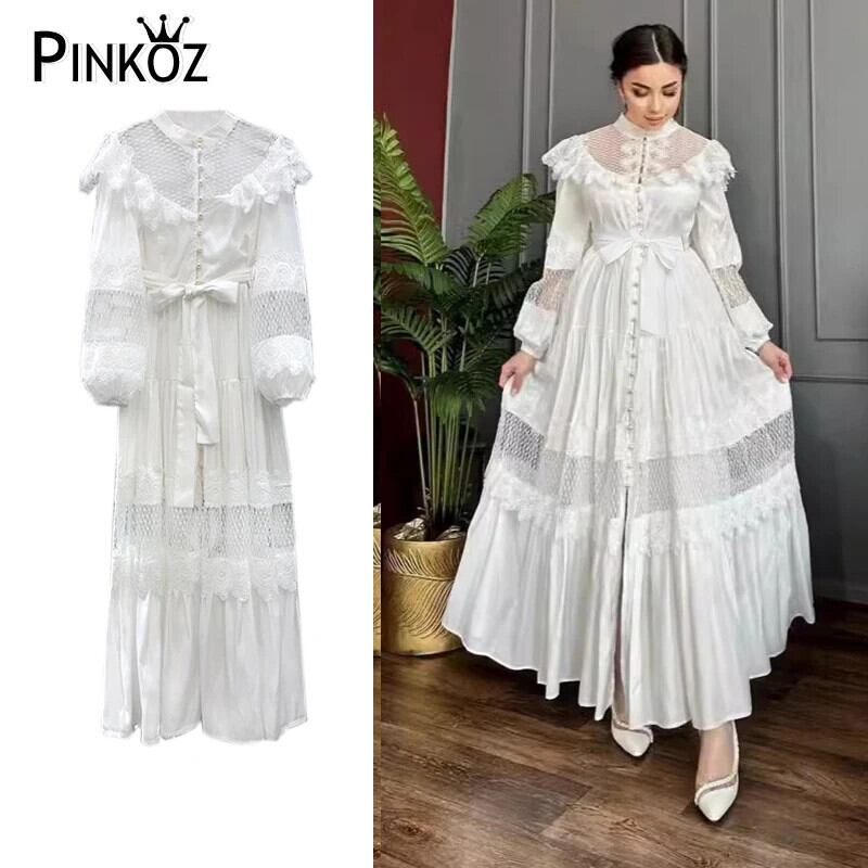 Pinkoz デザイナー白パッチワークスタンドカラー春秋パーティーエレガントシングルブレストヴィンテージドレス Vestidos ピンク ホワイト スプリング 春物 オータム 秋物 ビンテージ