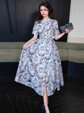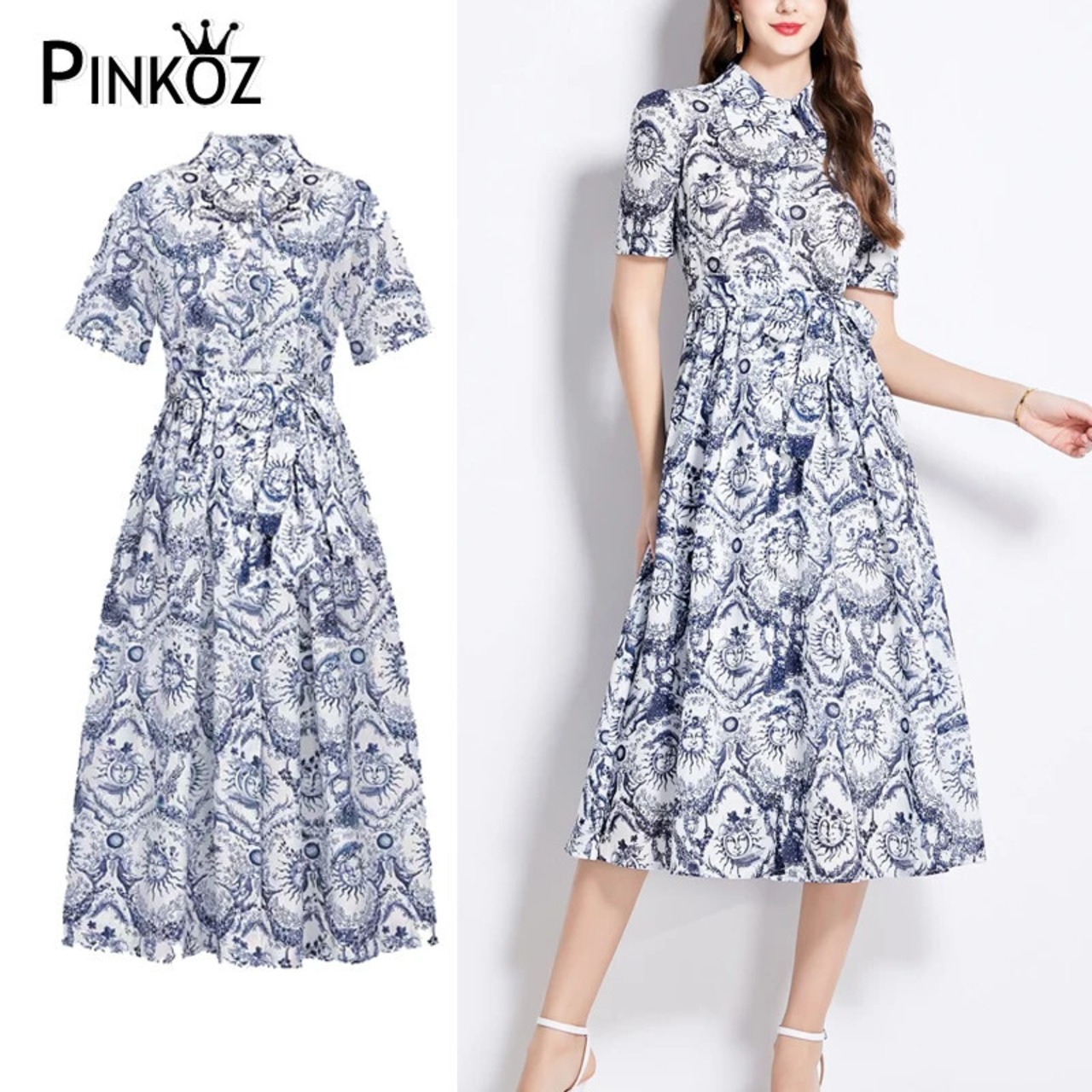 Pinkoz ランウェイデザイナースタイリッシュ花柄ドレスターンダウンカラー半袖 A ラインシングルブレストエレガントカジュアルローブ ショート ピンク ハーフスリーブ Aライン