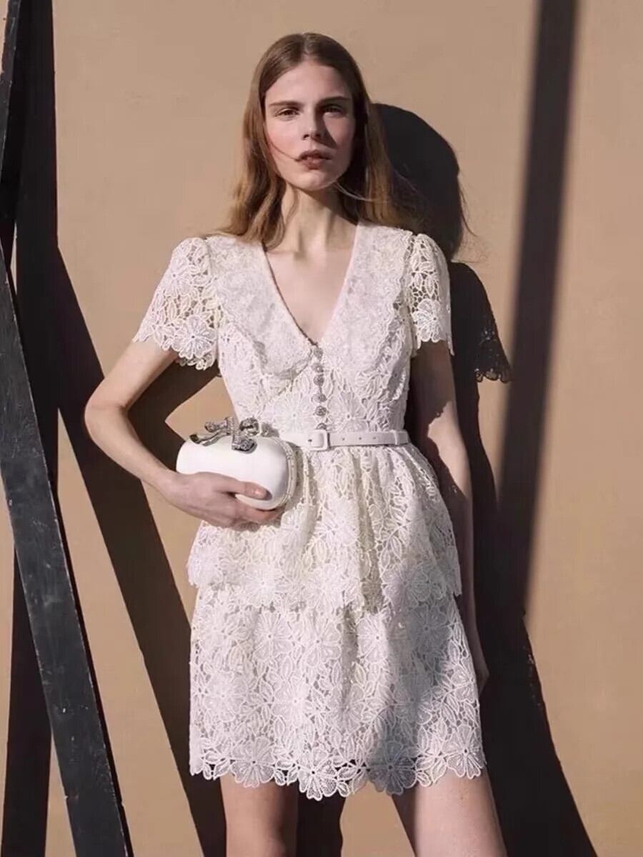 Pinkoz 滑走路デザイナー白いレースカスケード層状ピーターパン襟スタイリッシュドレス夏オフィスレディ Vestidos ベルト ピンク ホワイト レッド サマー 夏物 ハーネス 会社 学校 通勤や通学にも