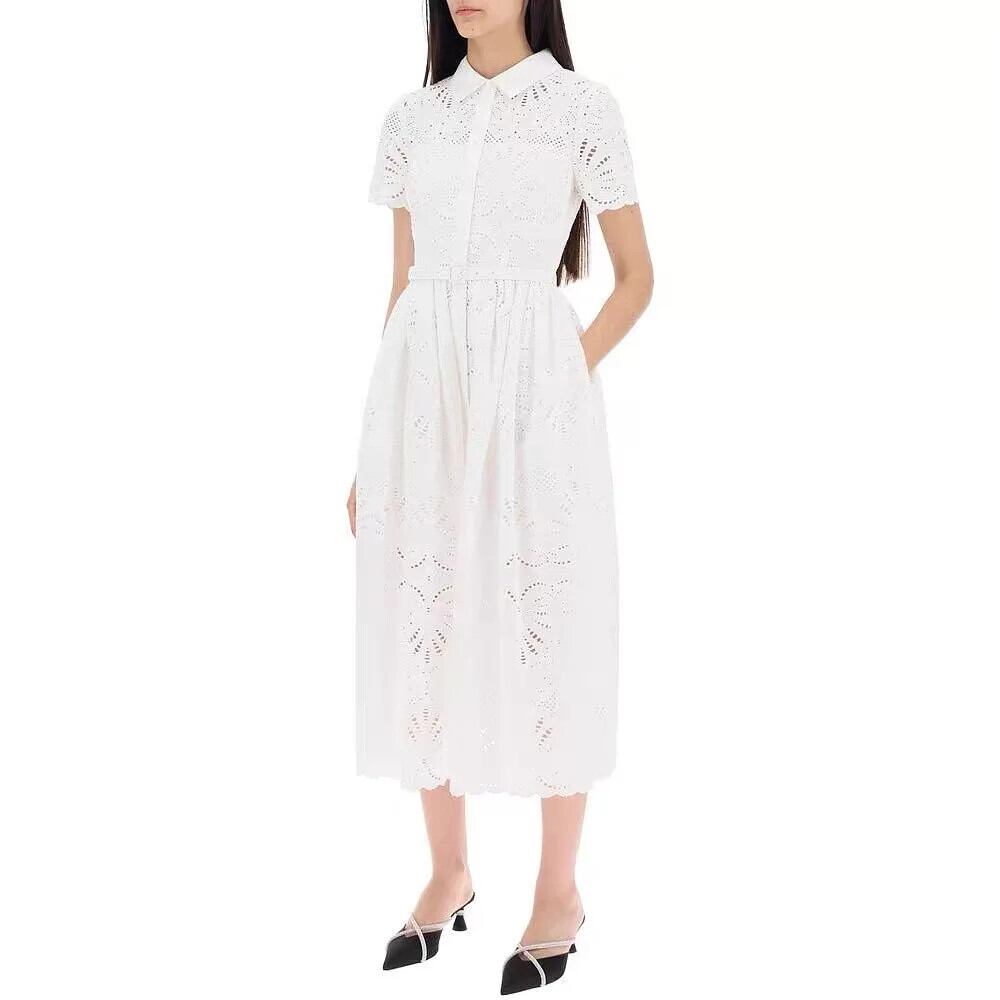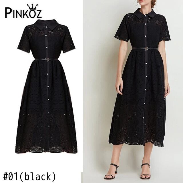 Pinkoz 滑走路エレガントでスタイリッシュブラックレースアウトミディロングドレスターンダウン襟半袖夏vestidos ショート ピンク ハーフスリーブ サマー 夏物