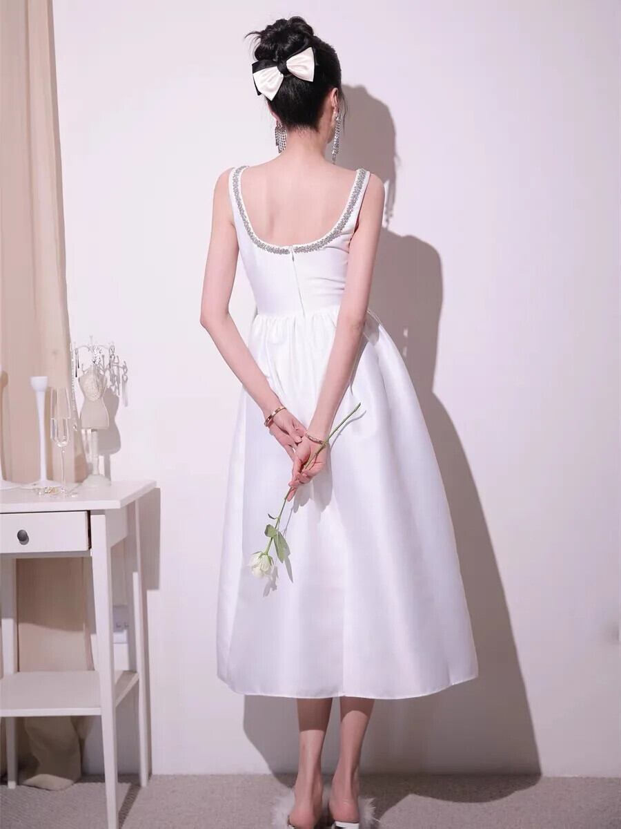 Pinkoz 滑走路デザイナースタイリッシュミディ A ラインエレガントセレブパーティー白いドレスクリスタルビーズダイヤモンドノースリーブドレス ピンク ホワイト Aライン