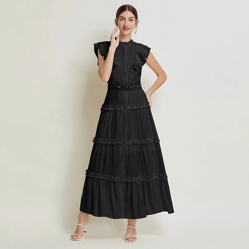 Pinkoz Dames Ruches Groene O-hals Maxi Jurk Met Riem Party Diner Franse Vestidos Kleding Chic Robe De ピンク