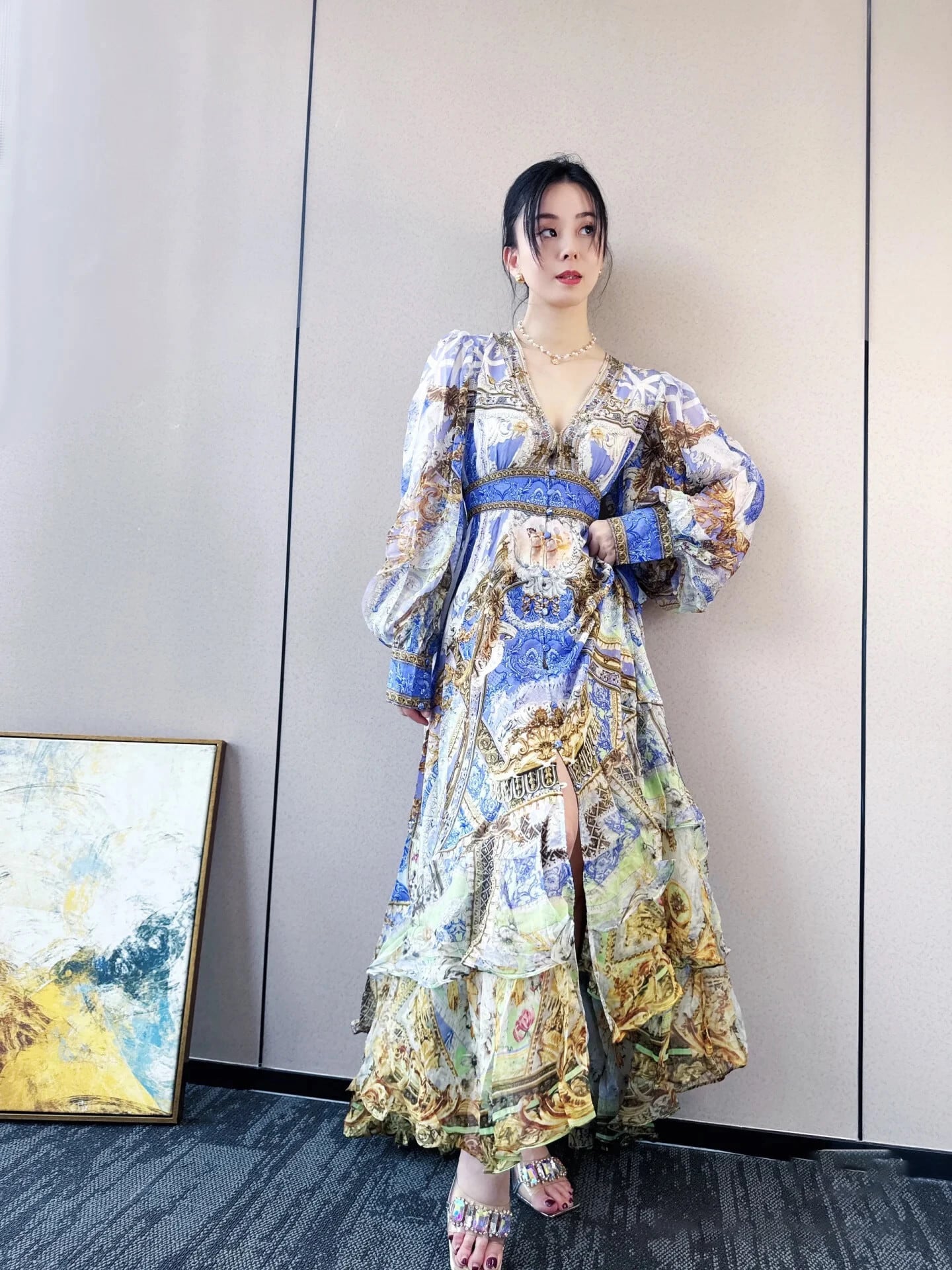 Pinkoz Promi stilvolle V-Ausschnitt blau Blumenmuster Frühling Sommer Nacht Party Maxi Lange Kleider für Frauen Boho Vestidos ピンク